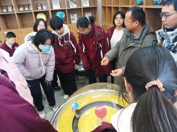 随后,同学们有序走进多个专业实验室开展沉浸式学习。在数字星球地理综合实验室,赵玉明博士以极具感染力的讲解风格,现场演示了数字星球系统、虚拟现实系统、AR沙盘系统、语音立体地形图系统、地图图层学习箱及各类实验套装的操作逻辑与应用场景;在天文气候实验室,他结合天文望远镜、天体演示仪等专业设备,深入浅出地阐释了天文现象与气候变化的内在关联;在地质地貌实验室,通过琳琅满目的地质标本,直观解析了各类地质构造的形成机理与演化过程。此外,同学们还近距离参观了学院学生自主研发制作的特色教具及其他专业实验室,深切感受地理学科的实践魅力。