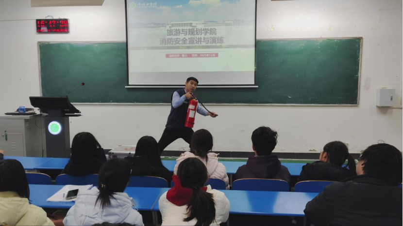 为强化师生消防安全意识,提升火灾应急处置能力,12月4日,旅游与规划学院组织师生开展消防知识宣讲活动,活动由消防讲师秦川主持,以“理论讲解+实践演练”的形式,为师生带来沉浸式消防安全教育。